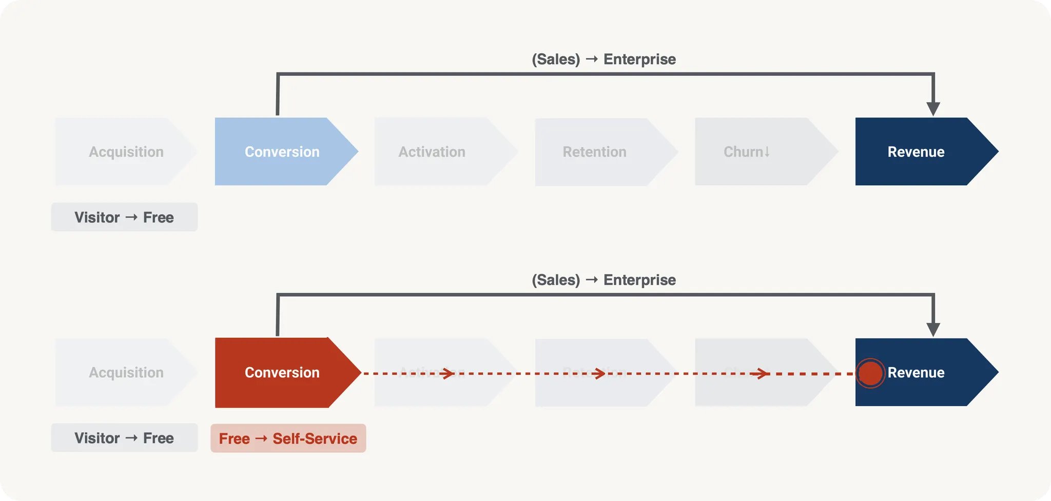 Self-Service๊ฐ€ ๋„์ž…๋˜๋ฉด ์‚ฌ์šฉ์ž ํƒ€์ž…์ด Free, Self-Service, Enterprise๋กœ ๊ฐ ์‚ฌ์šฉ์ž ๊ถŒํ•œ์— ๋Œ€์‘ ๊ฐ€๋Šฅํ•œ ๋Œ€์‹œ๋ณด๋“œ ๊ฐœ๋ฐœ์ด ํ•„์š”. Self-Service ๊ฒฐ์ œ ์‹œ์Šคํ…œ์ด ๋„์ž…๋จ์— ๋”ฐ๋ผ ๋ฐ”๋€Œ๊ฒŒ ๋˜๋Š” User Flow๋ฅผ ์žฌ์ •์˜.