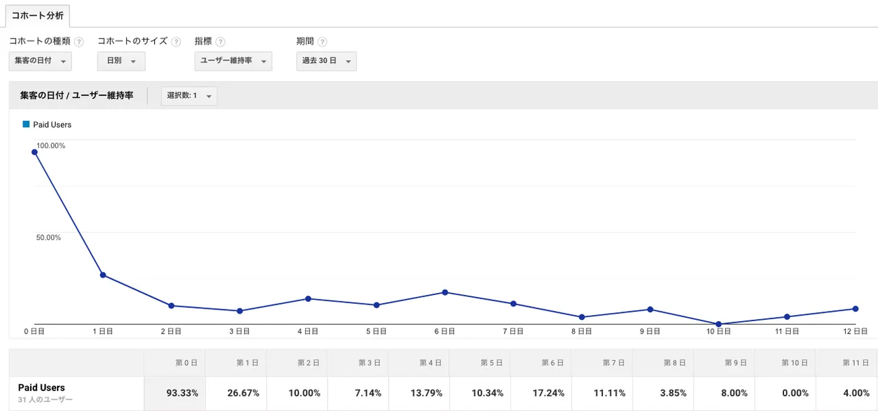 目標としていた数値はコホート分析でEnterprise User(10月19-25日基準)の1日目(15%)、2日目(5%)の数値を基に目標設定してました。以下のイメージはPaid Userの12月の日間ユーザー維持率で目標数値を達成したと思いましたが、GAのシステムエラーにより基に参照していたPaid Userの数値(10月19-25日基準)1日目1.12%、 2日目が0.00%が間違っていた可能性があり、過去データが見れないコホート分析の仕様でTop Pageリリース後にどのぐらい改善されていたのかは把握ができてません。