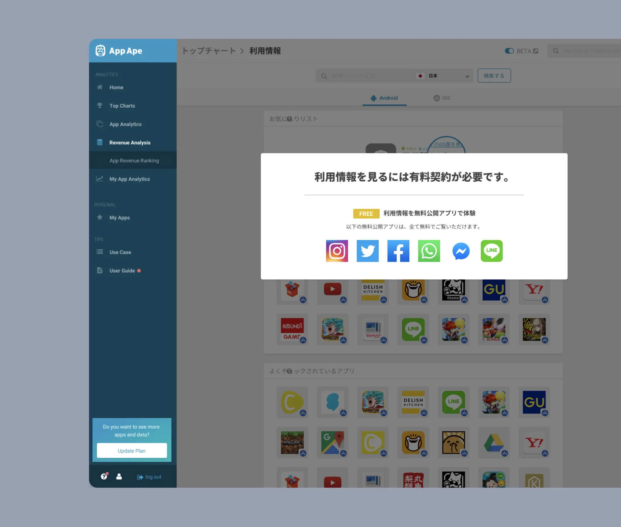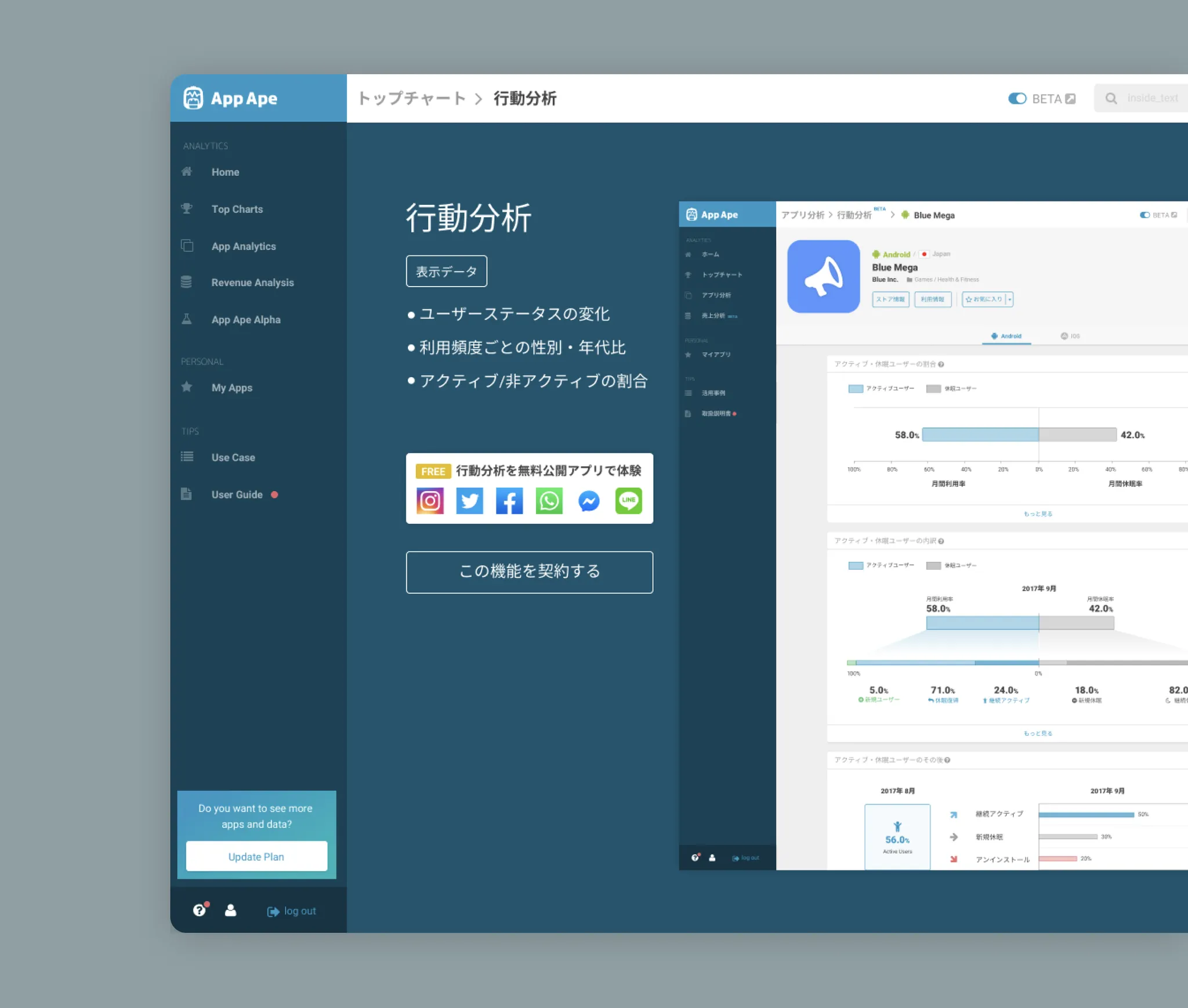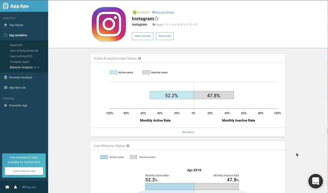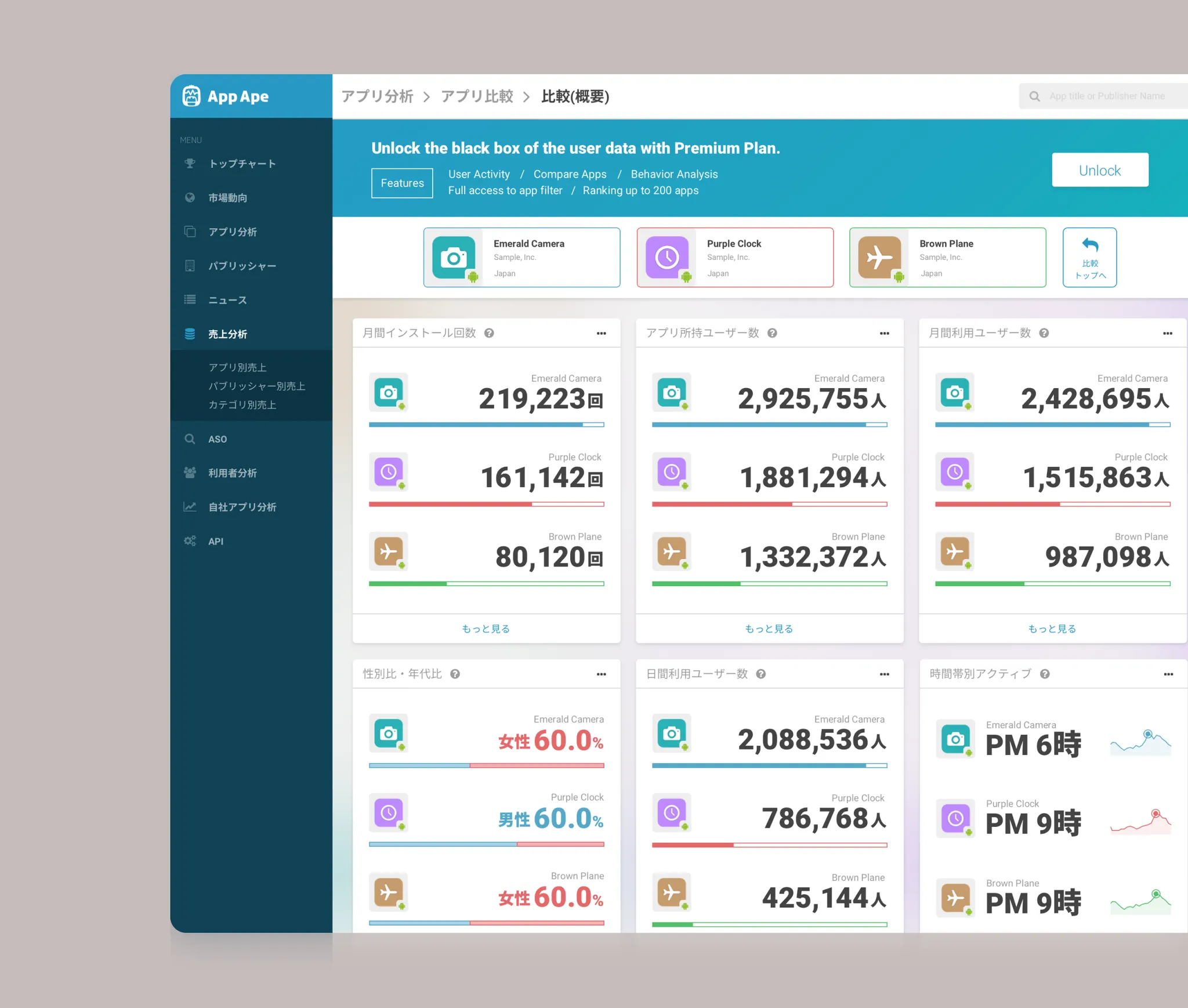 アプリの実使用情報·アプリ比較機能、ユーザー行動分析などサンプルアプリに限り詳しいデータも確認可能。