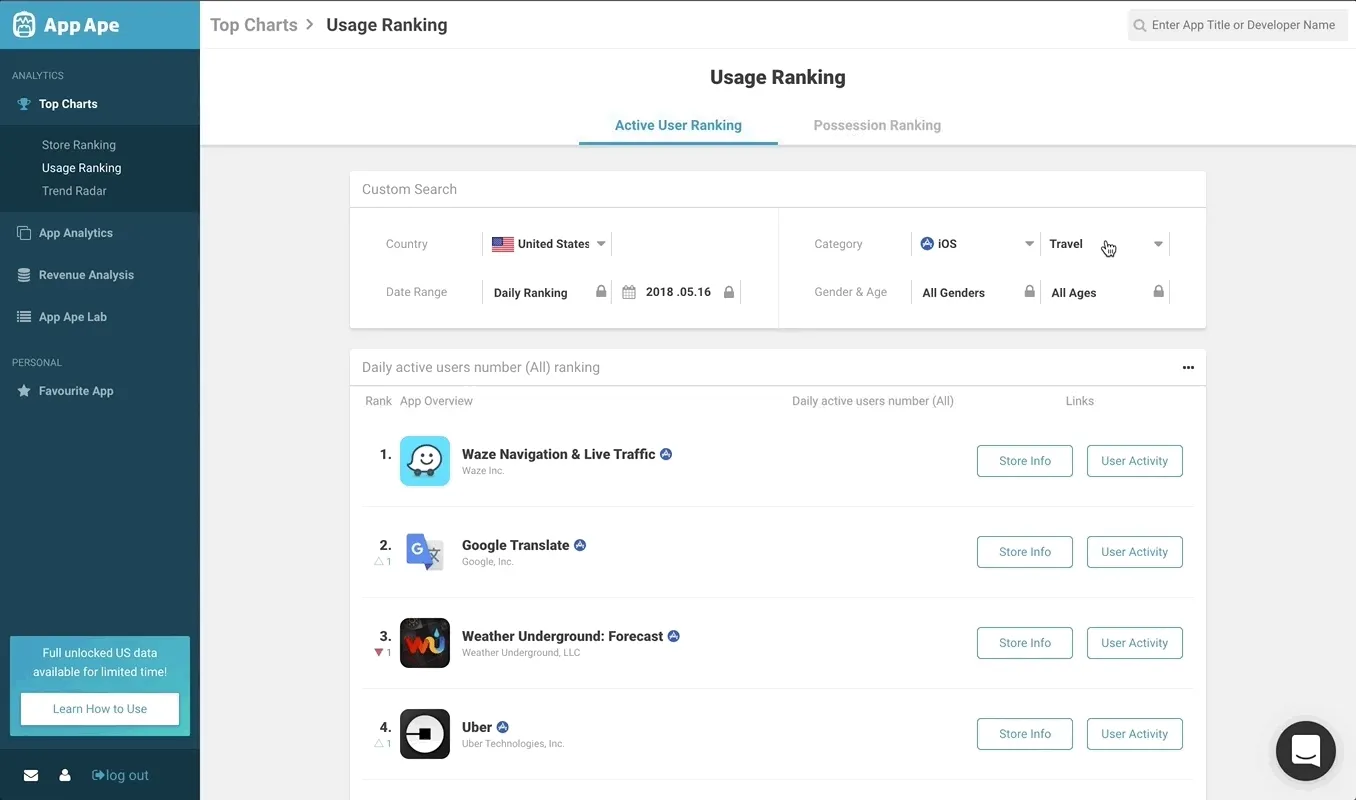 これまで提供されていたストアランキングやストア情報に加え、実使用アプリランキング(インストールユーザー基準·活性ユーザー基準)とトレンドランキング機能の一部データ閲覧が可能。