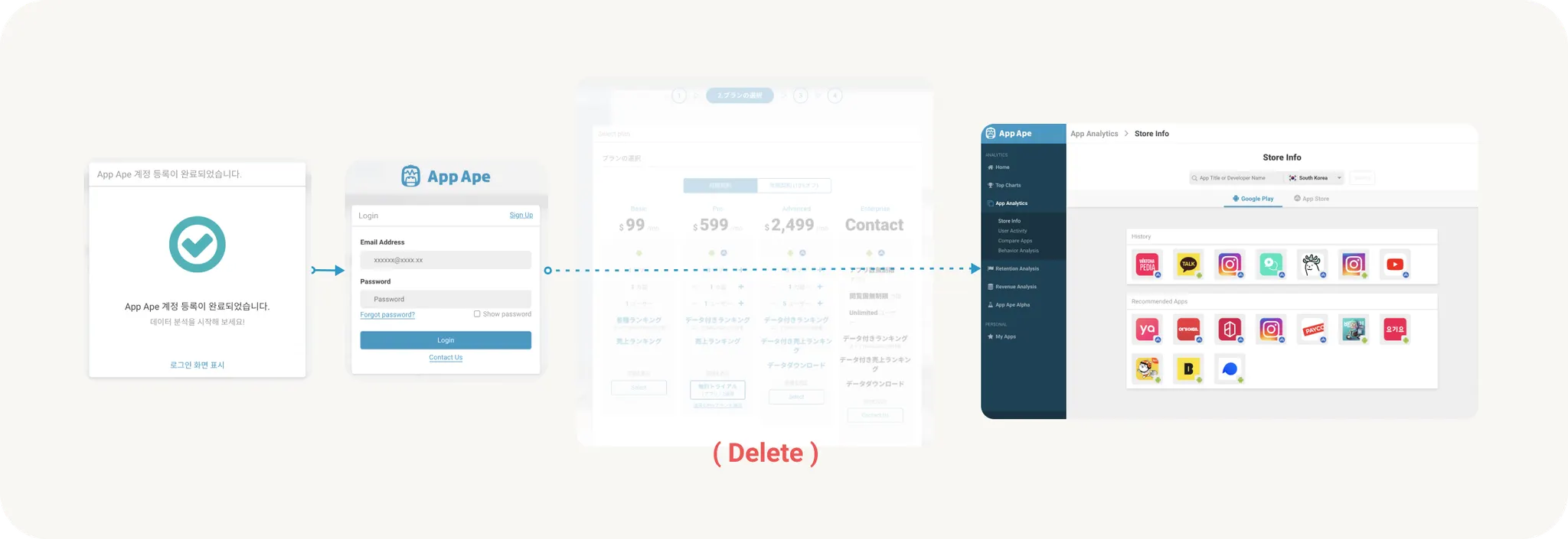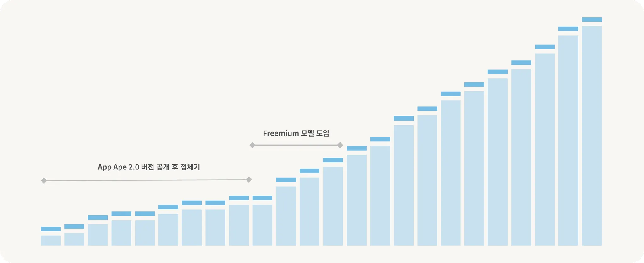 App Apeではユーザビリティの改善やシステムのメンテナンスのためには、デザインやデータ処理システムを新たに設計する必要があると判断し、メジャーアップデートを実施したが、ユーザアカウントが連動していなかったため、既存ユーザは新たに加入しなければならない状況。