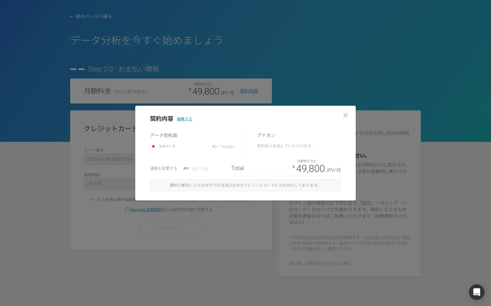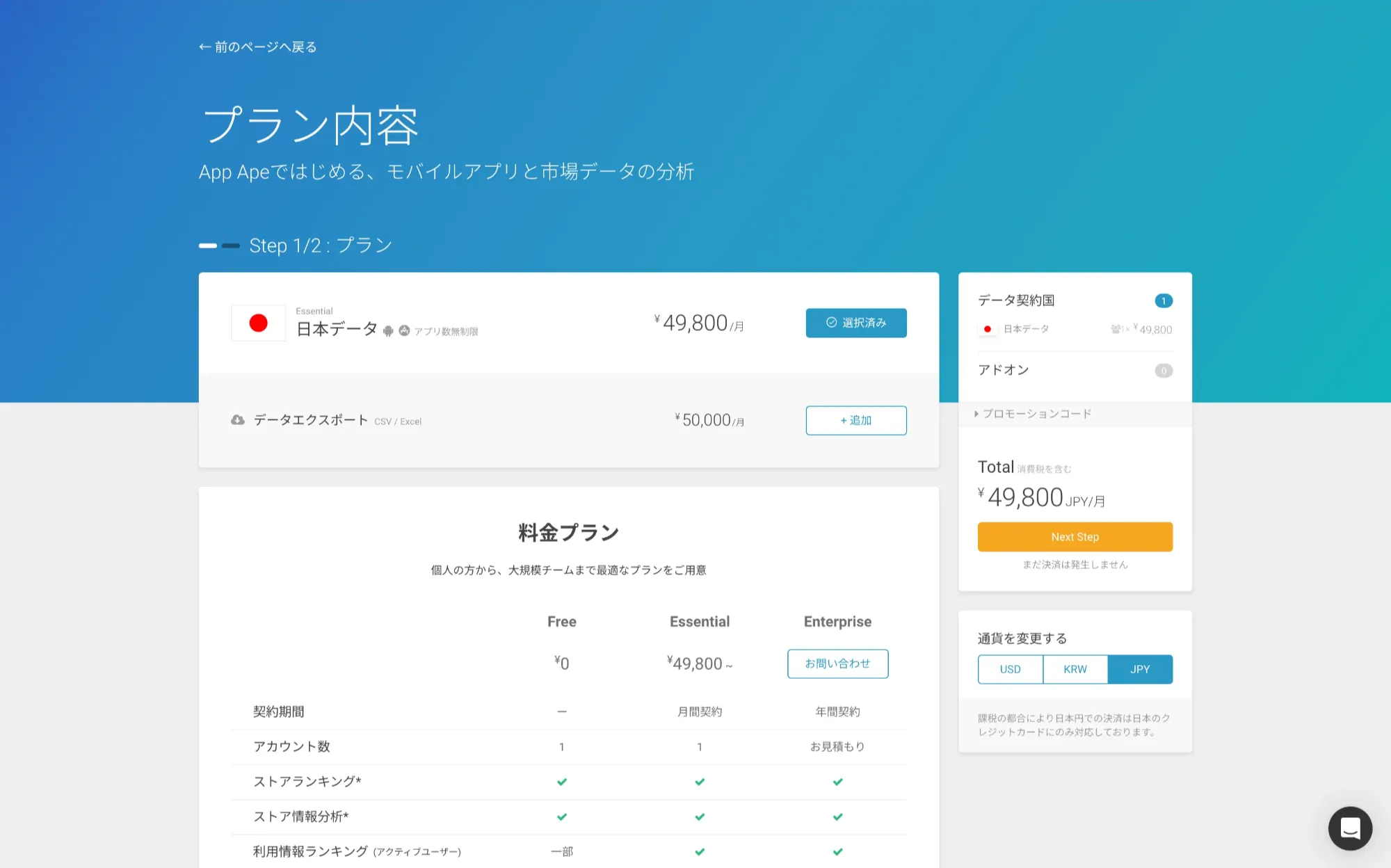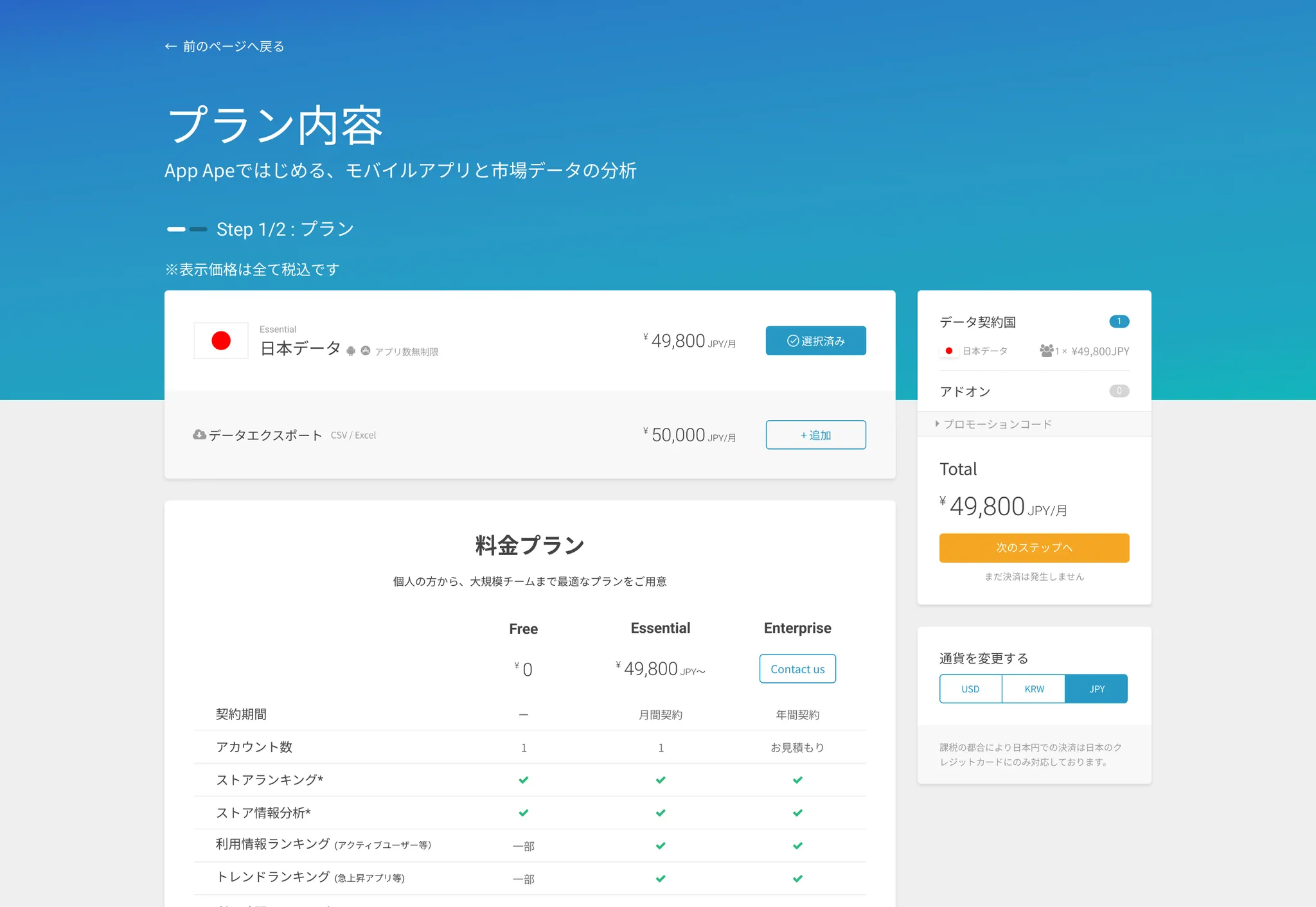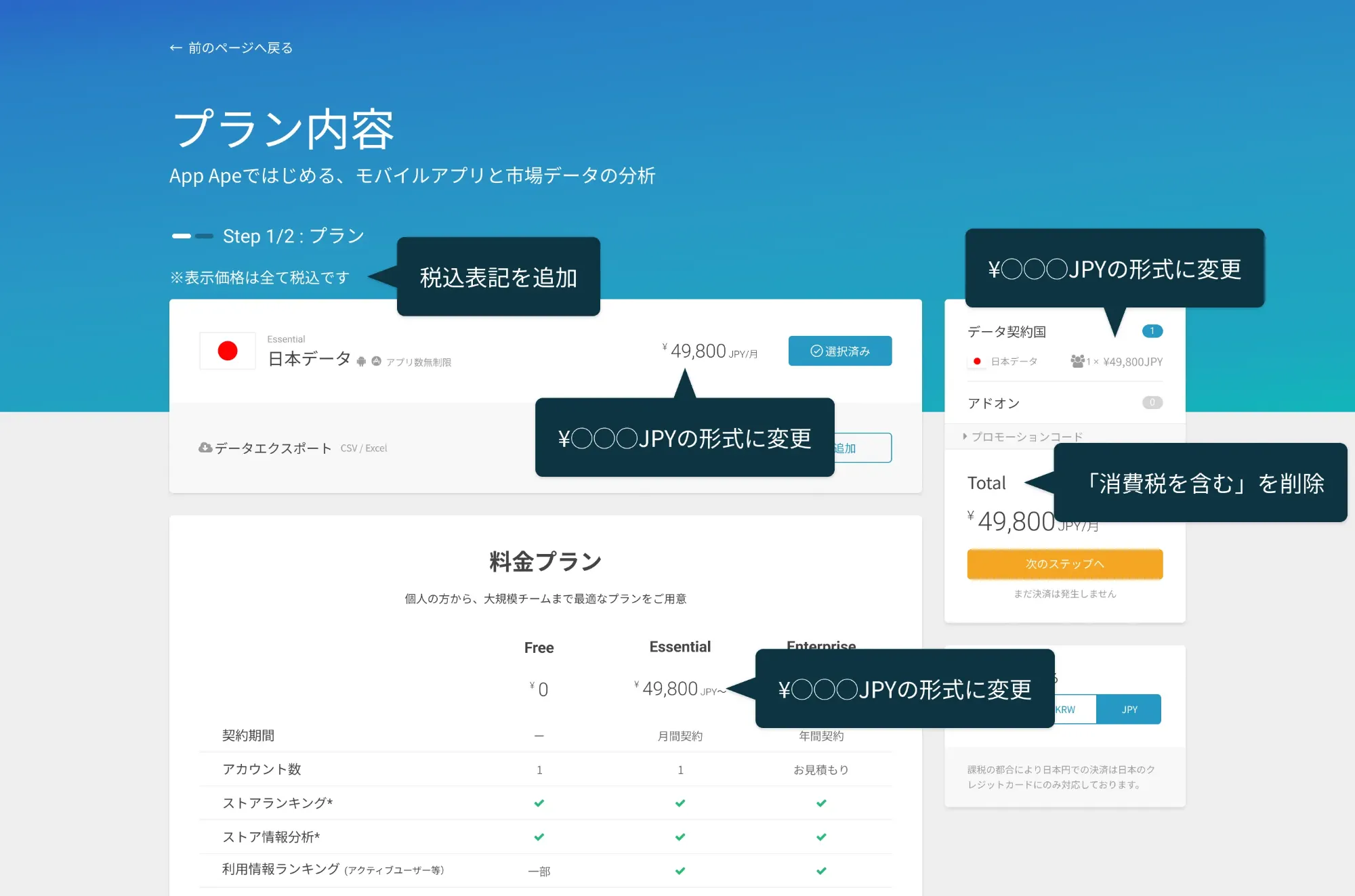 플랜 페이지의 가격 표시를 ¥49,800JPY 와 같은 [통화 기호 + 숫자 + 통화 코드] 형식으로 변경.