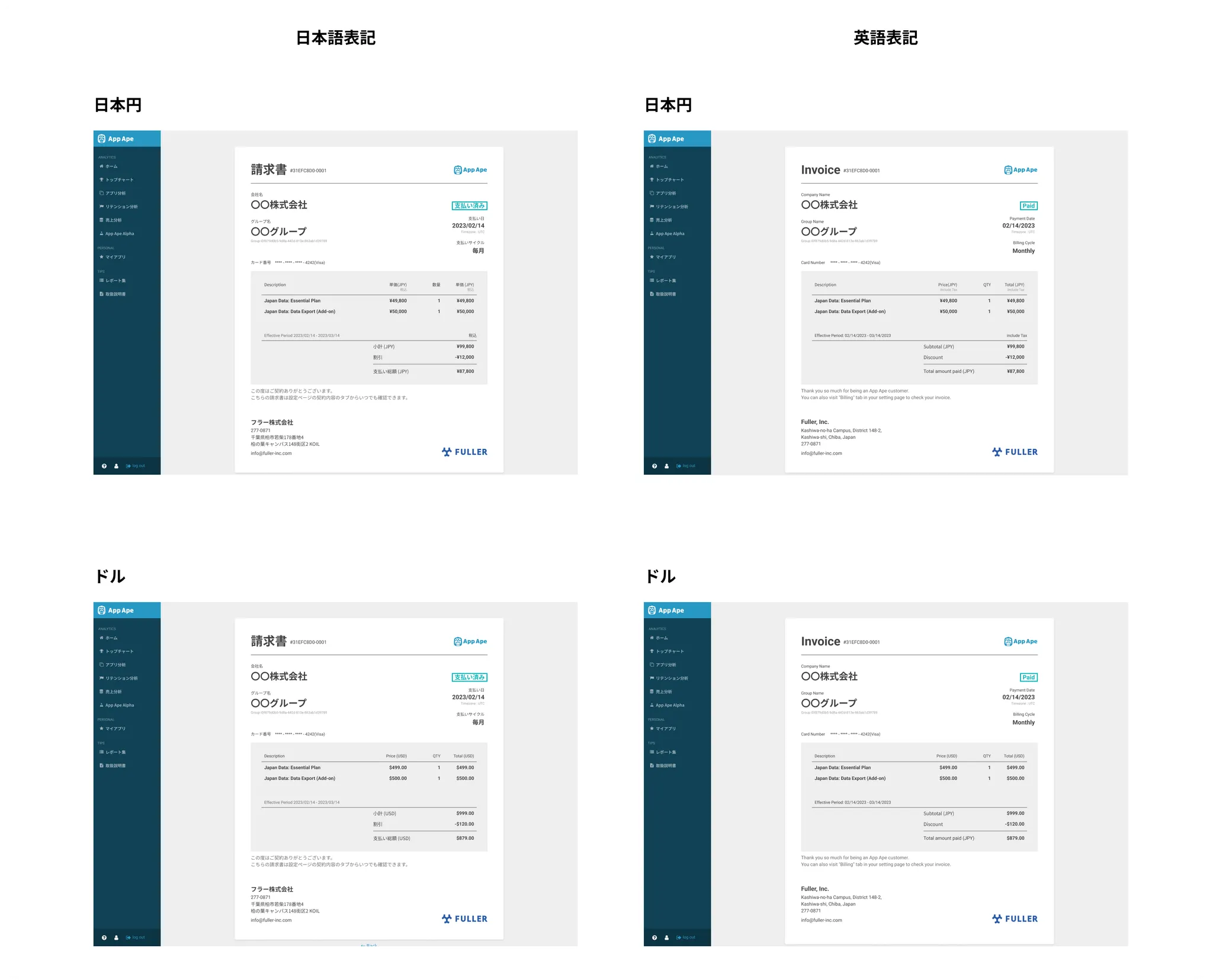결제 서비스 제공 업체인 Stripe에서 인보이스 제도에 맞춘 샘플 정보를 공개하였으며 앱에이프도 그에 맞춰 필요한 항목을 넣은 인보이스를 설계. 해당 내용을 통해서 법무팀 리뷰 완료 후 개발에 착수하였음.